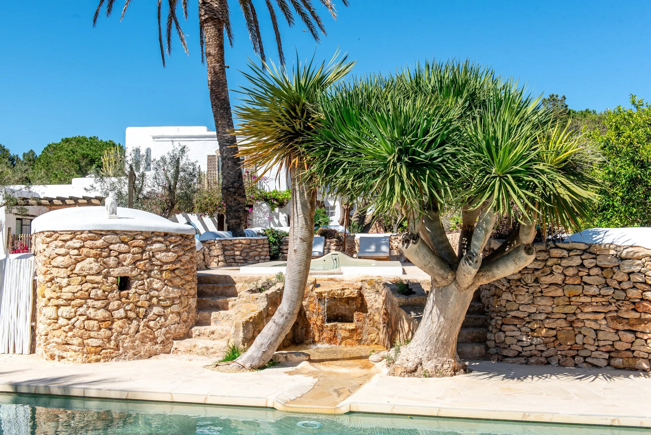 This idyllic haven has five bedrooms, and a separate Casita, all featuring en-suite bathrooms. Spread across an expansive 8,000 square meters in the tranquil Ibizan countryside., with a large and enticing saltwater pool, surrounded by exotic palms and crowned with a huge Bali bed to relax, read or sleep on.